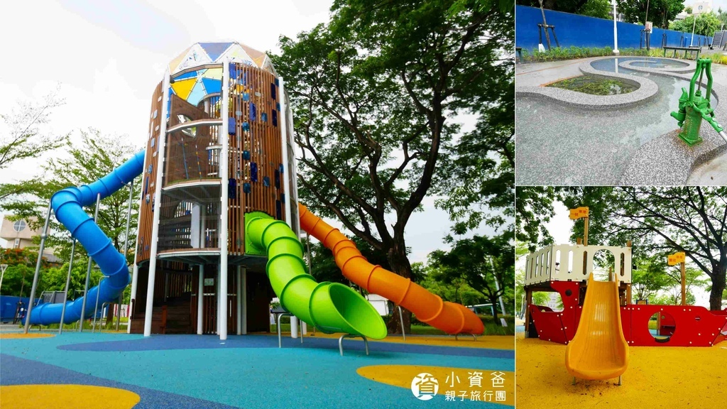 東港兒童公園改建的十分棒,主體的樹海闖關塔類似臺北南港的東陽公園,小資爸很喜歡這種塔型結構的溜滑梯,越往上關卡的難度就越高,可以讓不同的年紀都能溜滑梯,頂部的尾魚圖案雖然很具象,但相當有在地特色,東港1號遊戲區更是凸顯東港的文化背景,戲水區的設計也很棒,不僅可以玩水,也能透過水幫浦的運作來了解水的流動,另外包含盪鞦韆以及體健設施也是採用國外遊具品牌最新的設計,真的非常厲害,不管任何年紀到這裡都有適合的遊具,而且公園的樹蔭蠻多的,不像有些新公園完全沒有遮陽,小資爸很推薦大家專程來玩~