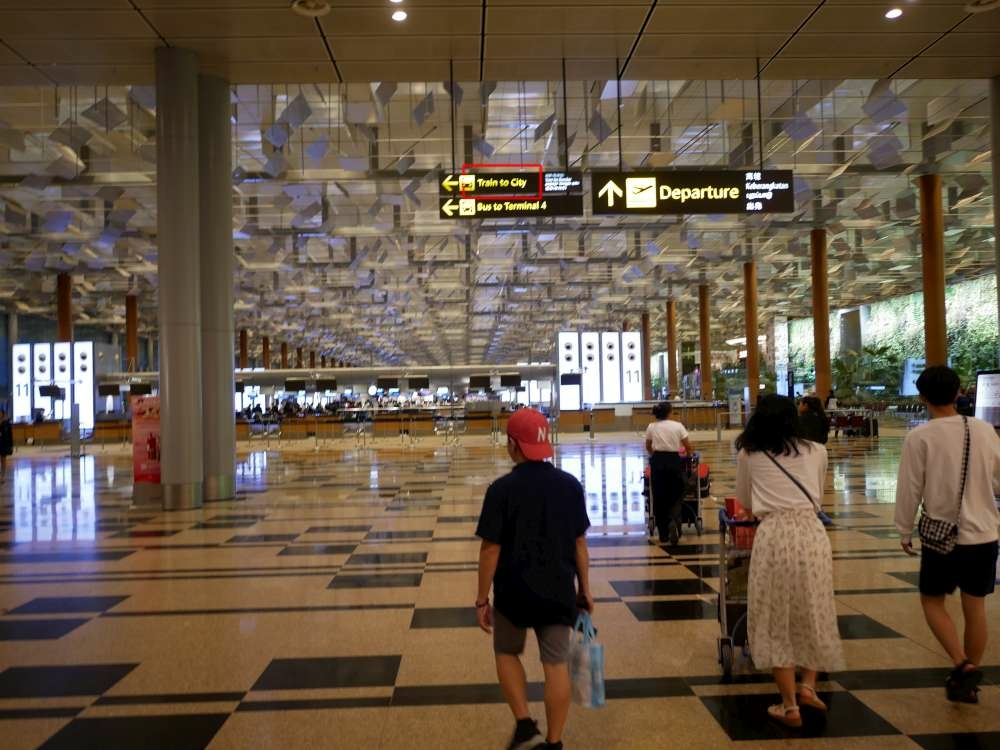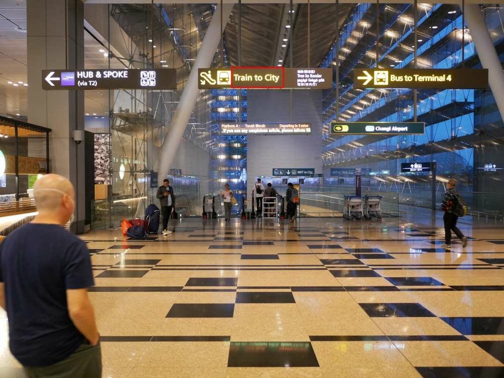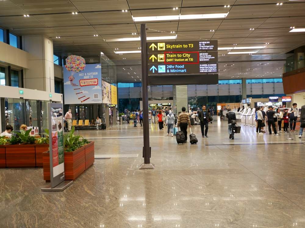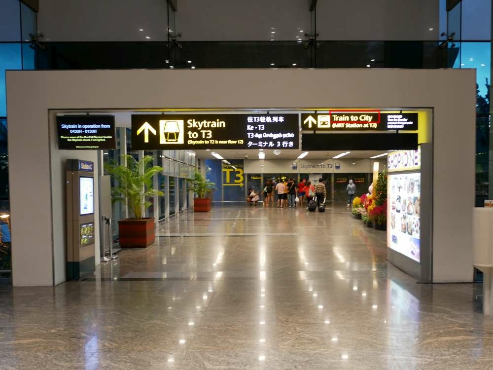 樟宜機場地鐵站在T2與T3之間,T1要搭SkyTrain到T3 (都跟著TRAIN TO CITY指標走)
