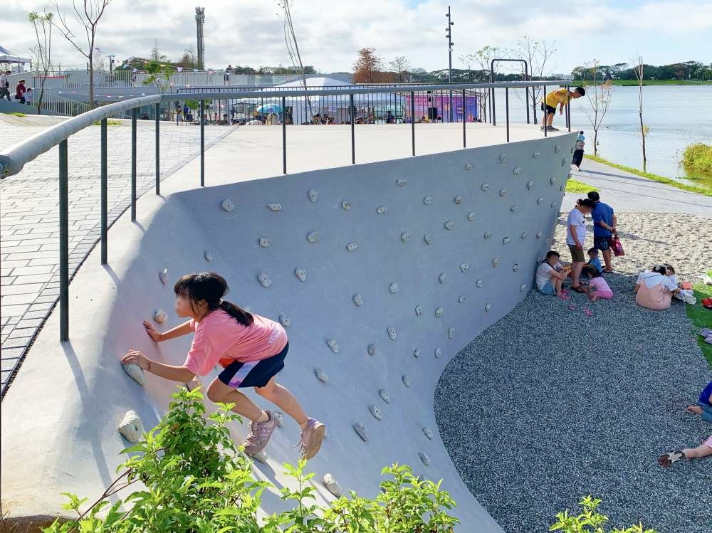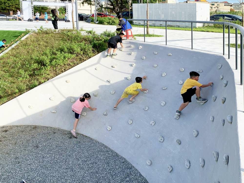 ▼這個牆面設計的很棒,越往右邊攀爬的幅度越接近垂直90度甚至到120度,所以能力好的孩子盡可能往斜度大的地方挑戰