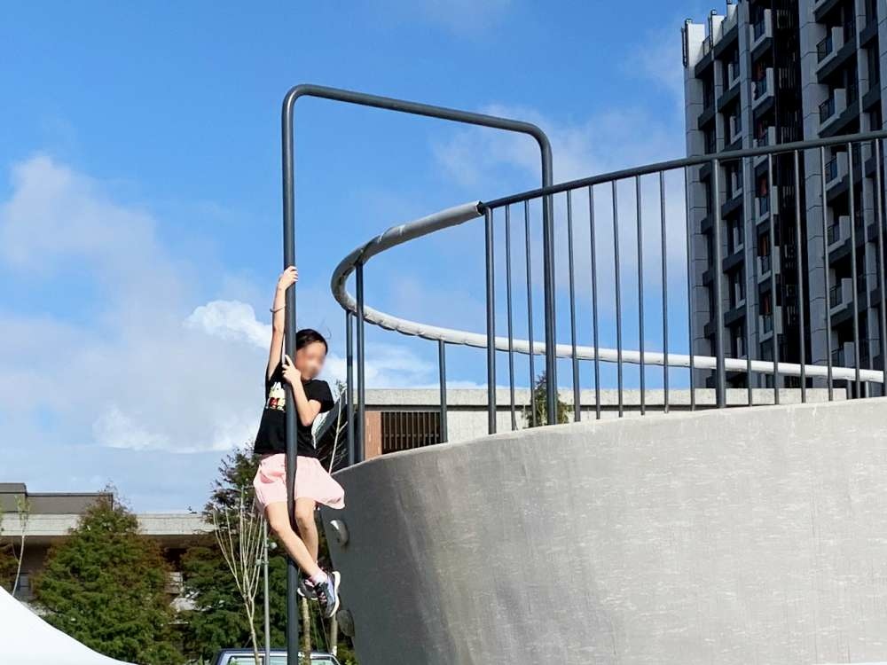 ▼攀岩牆上去還有消防滑竿,滑竿跟牆面有點距離,還蠻有挑戰性的